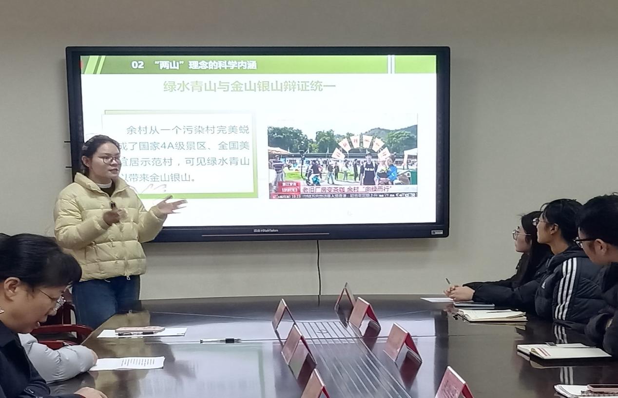 我院丁蓉蓉老师就“绿水青山就是金山银山”这一主题进行教学展示。丁老师精心设计教学环节,将理论阐释与现实问题相结合,以清晰的逻辑架构、鲜活的时代素材和富有感染力的教学语言,呈现了一场高质量的思政示范课,赢得了在场教师的一致好评。