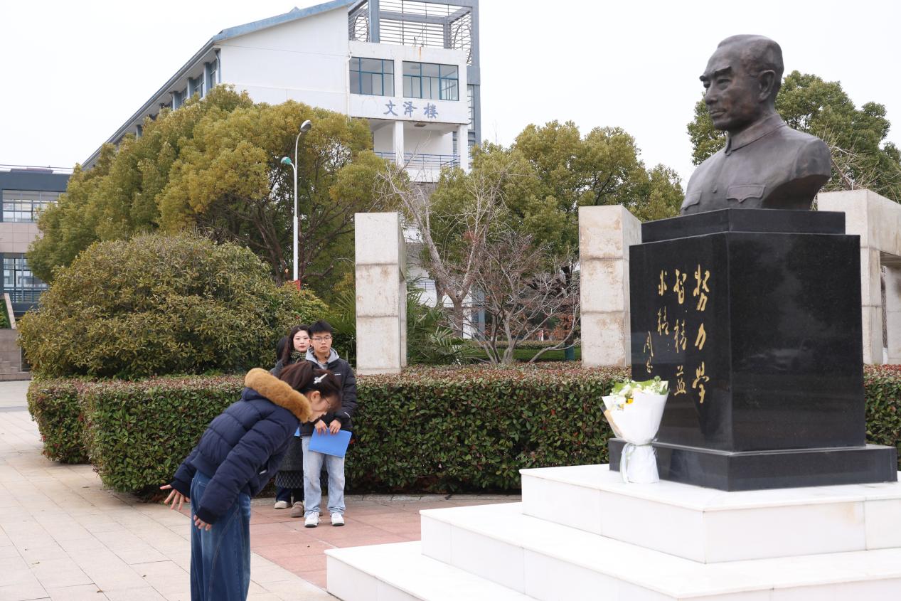 敬献鲜花环节,翔宇社学生代表杨美辰同学迈着沉稳的步伐,缓缓走向周恩来铜像,将承载着全校师生深切思念的鲜花整齐摆放在铜像基座前并鞠躬致意,寄托绵绵追思。